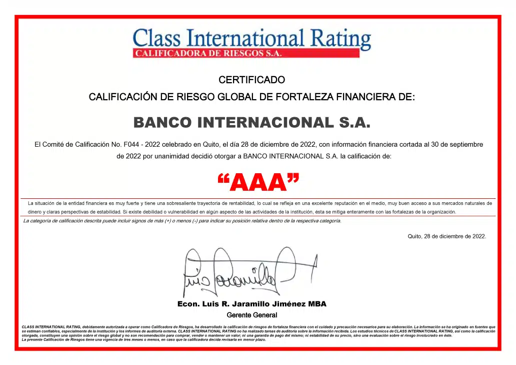 El informe de Calificación de Riesgo efectuado en diciembre de 2022 por Class International Rating, otorgó a Banco Internacional S.A la calificación AAA.